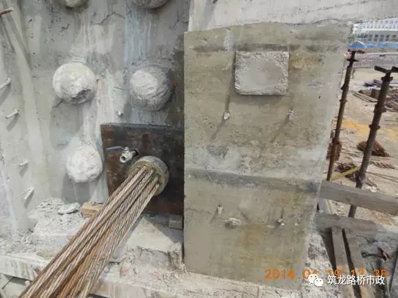 錨墊板下混凝土應(yīng)力為集中,在張拉過(guò)程中多因混凝土強(qiáng)度不足而崩裂凹陷。