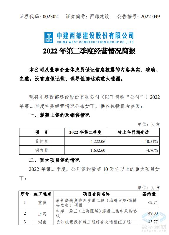 西部建設(shè)今年二季度混凝土簽約量下降10.51%
